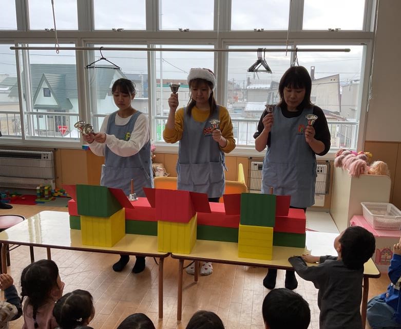 12月24日にクリスマス会をしました♬ 今年も東栄保育園の子ども達にサンタさんがプレゼントを持ってやってきました。サンタさんの登場に大喜びの子ども達は、プレゼントを受け取ると「ありがとう」と満面の笑みを浮かべながらお礼を伝えることが出来ました。 保育士のお楽しみでは、上のクラスではクリスマスメドレーのハンドベルを、下のクラスはサンタさんのパネルシアターを見て楽しみました。 |