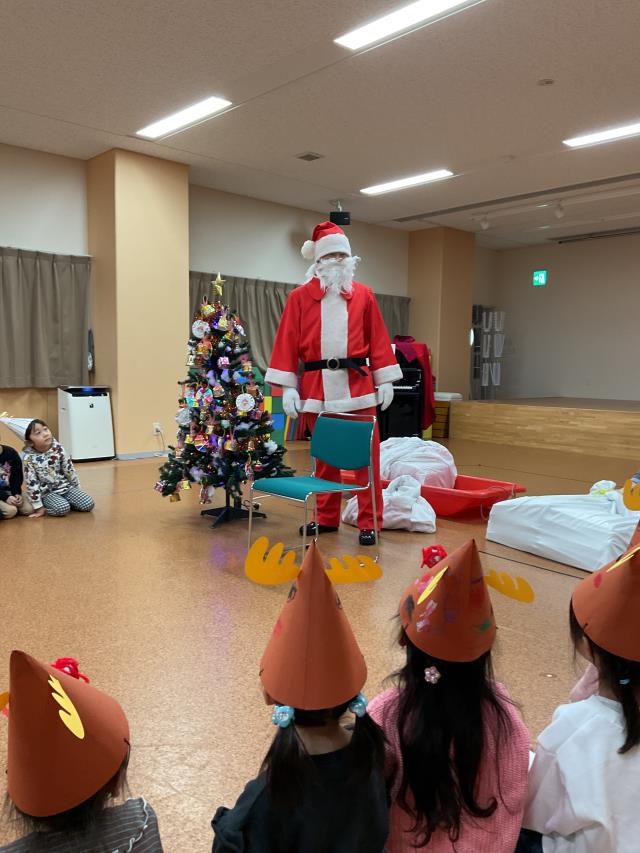 東栄保育園にサンタさんがプレゼントを届けに来てくれました。サンタさんの登場にびっくりしていましたが、プレゼントを見つけると「プレゼントだ!」ととても喜んでいました。その後はエプロンシアターやスケッチブックシアターを見て楽しみました。 |